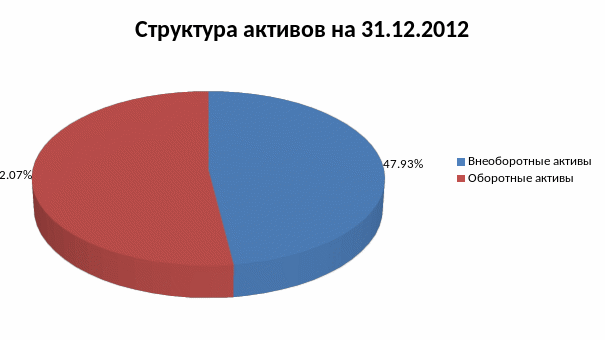 Более наглядно соотношение внеоборотных и оборотных активов организации на 31.12.2012 представлено на диаграмме (см. рис.2.10).