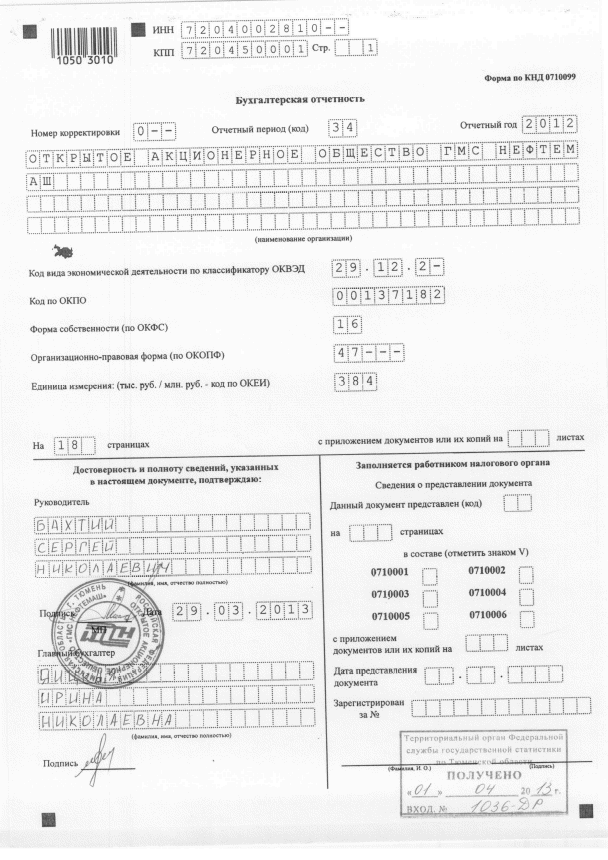 Бухгалтерский баланс ОАО «ГМС Нефтемаш», 2012 год.