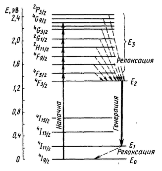 Оптическая накачка переводит ионы Nd3+ из основного состояния 4I9/2 в серию возбужденных состояний, состоящую из большого числа узких, частично перекрывающихся друг с другом уровней. Основные полосы накачки расположены на длинах волн 0.73 и 0.8 мкм. Последняя полоса удобна для накачки полупроводниковыми лазерами и светодиодами на основе арсенида галлия. С этих уровней энергии осуществляется быстрая релаксация на метастабильный уровень 4F3/2 с временем жизни τ21 = 0.23 мс. Переходы с этого уровня в состояния 4I15/2, 4I13/2, 4I11/2 и 4I9/2 сопровождаются эффективной люминесценцией в области длин волн 1.8; 1.3; 1.06 и 0.95 мкм. Наиболее сильным является переход 4F3/2 4I11/2 в области 1.06 мкм. Обычно на этом переходе и осуществляется генерация. Уровень 4I11/2 является нижним рабочим лазерным уровнем при генерации в области 1.06 мкм, расположен примерно на 0.25 эВ выше основного состояния 4I9/2. Эти уровни связаны между собой быстрой безызлучательной релаксацией. В то же время расстояние между ними существенно больше kT, что обеспечивает эффективное опустошение нижнего рабочего уровня и определяет четырехуровневый характер генерации неодимового лазера.