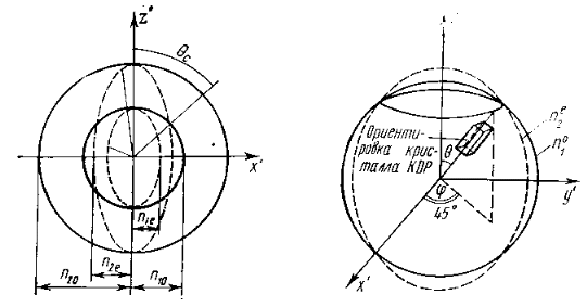 На рис. 10 схематически показано сечение поверхностей показателей преломления для отрицательного одноосного кристалла (оптическая ось обозначена через z’). Для него на данной фиксированной частоте ne<no. Именно таким кристаллом является кристалл KDP (дигидрофосфат калия), применяемый в настоящей работе.
