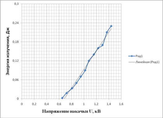 Рис. 30.Зависимость энергии излучения от напряжения накачки на длине волны λ = 1064 нм.
