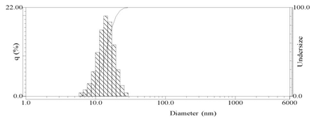 Рис.7. Типичная гистограмма распределения частиц по размерам в стандартном мицеллярном растворе наночастиц серебра, полученная методом ФКС. Средний размер частиц – 14.1 нм.