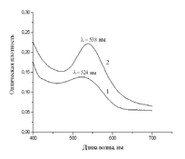 в течение последующих 10-15-ти мин интенсивностьокраски усиливается, затем изменения цвета прекращаются и этот красно-фиолетовый раствор сохраняется в течение нескольких лет. При меньших степенях гидратации изменения цвета происходят медленнее; вначале появляется ярко-красная (рубиновая) окраска, которая видна первые 5-10 мин. Затем постепенно проявляется фиолетовый оттенок, через 40-60 мин раствор приобретает устойчивый красно-фиолетовый цвет. Пример спектров красного (w=0.75) и красно-фиолетового (w=2) растворов показан на рис.8. Максимумы поглощения в обоих случаях лежат в области характерного максимума наночастиц золота: для красного раствора – при 523-526 нм, для красно-фиолетового – при 537-538 нм.