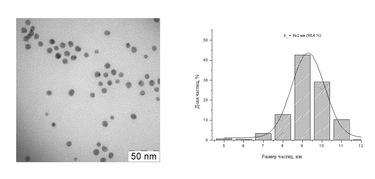 Для прикладных исследований была разработана стандартная процедура, позволяющая получать растворы с концентрациями наночастиц порядка нескольких миллимолей (нескольких сотен мг/л) и средними размерами в интервале 8-10 нм. На рис. 6 показан пример электронной микрофотографии и соответствующего распределения по размерам в стандартном мицеллярном растворе.