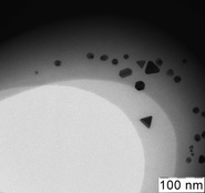 Кроме того, здесь образуются частицы разных форм – помимо сферических, имеются также треугольные, пятиугольные, шестиугольные и цилиндрические частицы; пример частиц разной формы крупным планом показан на рис.11. На многих фотографиях выявляется также кристаллическая структура наночастиц, что подтверждается