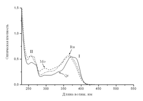 Рис.4 (сверху). Спектры оптического поглощения флавоноидов – кверцетина (Qr), рутина (Ru) и морина (Mo) в мицеллярных растворах. I и II - две основные полосы поглощения.