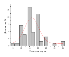 большего размера, с заметным разбросом; анализ гистограммы в Гауссовом приближении дает 16 ± 8 нм.