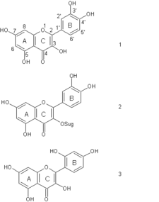 Рис.3 (слева). Структура молекул флавоноидов, используемых в биохимическом синтезе. 1 – кверцетин, 2 - рутин, 3 – морин. Sug – дисахарид, состоящий из остатков глюкозы и рамнозы.