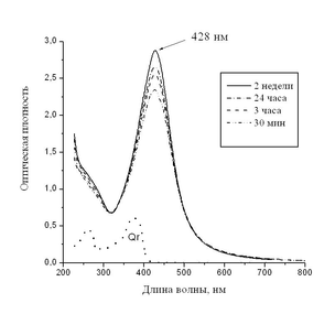 Контроль формирования и стабильности, а также исследования оптических и адсорбционных свойств наночастиц осуществляли путем измерения спектров оптического поглощения с использованием спектрофотометров Specord M40 (Carl Zeiss, Германия) и Helios-α (Thermo Electronics, Великобритания). Размеры частиц в растворе определяли методом фотонной корреляционной спектроскопии (ФКС) на приборах Coulter N4 MD (Coulter Electronics, США) и Horiba LB 550 (Horiba, Япония). Микрофотографии наночастиц получали методом просвечивающей электронной микроскопии (ТЕМ). Для этого использовали электронный микроскоп LEO912 AB OMEGA с ускоряющим напряжением 120 кВ (Carl Zeiss, Германия), доступный в центре коллективного пользования биологического факультета МГУ.