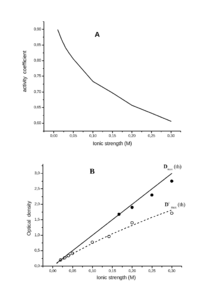 Рис.17. Проявление неидеальности водного раствора нитрата серебра. А – зависимость коэффициента активности () от концентрации раствора AgNO3 , рассчитанная по теории Дебая-Гюккеля в интервале 0.01-0.1 М и по уравнению Гиббса-Дюгема в интервале 0.1-0.3 М. В – Сравнение теоретических (линии) и экспериментальных (точки) зависимостей значений Dmax на стационарной стадии от концентрации соли серебра в исходном водном растворе. Сплошная линия – идеальный раствор ( = 1). Штриховая линия – раствор, в котором изменяется как на рис.17А.о – нитрат, - диамминнитрат