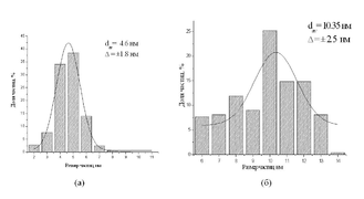 На рис.18 приведены гистограммы распределения по размерам для наночастиц серебра, полученных при одинаковых концентрациях кверцетина, соли металла, АОТ и степенях гидратации w =3.7 (a) и 10 (б). Видно, что в первом случае средний размер и ширина распределения (4.6 ± 1.8 нм) существенно меньше, чем во втором (10.35 ± 2.5 нм). Такое различие имеет значение, например, для исследований влияния размера наночастиц на их биологическую активность.