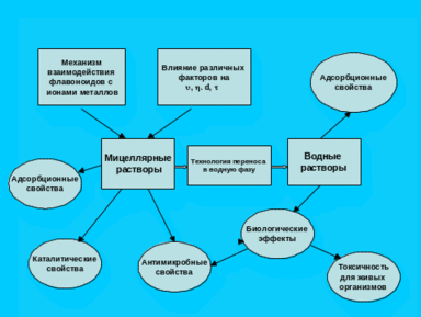 На мицеллярных растворах проводились исследования влияния различных факторов на скорость формирования, выход, размеры и стабильность наночастиц, а также механизма взаимодействия флавоноидов с ионами металлов в обратных мицеллах, лежащего в основе синтеза наночастиц.