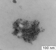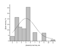 Видно, что частицы в основном сферические, малого размера; более 80% частиц имеют диаметр 2-7 нм. Обработка гистограммы в приближении распределения Гаусса дает средний размер 5.05 ±3.94 нм. Имеются также стержнеобразные частицы толщиной около 5-ти нм и длиной 30-50 нм.