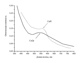 ис.12.. Спектр поглощения наночастиц меди, полученных биохимическим синтезом (CuQr) на стационарной стадии, w = 3.7. Для сравнения показан спектр наночастиц меди, полученных в обратных мицеллах восстановлением гидразином (CuH) при w = 4 [Lisiecki I., Pileni M.-P., 1995].