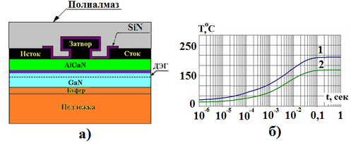 Рис.4. Структура СВЧ транзистора со слоем полиалмаза на поверхности (а) и зависимость температуры разогрева активной области СВЧ транзистора от длительности СВЧ импульса: 1 – без слоя полиалмаза, 2 – со слоем полиалмаза толщиной 1мкм.