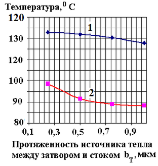 Расчет максимальной температуры на поверхности кристалла в зависимости от протяженности источника тепла в канале транзистора между затвором и стоком bТ проводился для структуры с шириной затвора 4 мм при плотности мощности в структуре 8 Вт/мм. При расчете учитывалось, что основной источник тепловыделения в СВЧ транзисторе расположен между затвором и стоком и имеет размер bТ, близкий к длине затвора Lg ( ~ Lg).