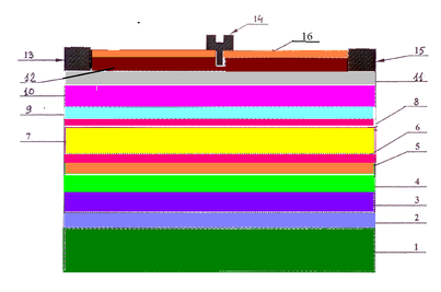 Рис.5 Структура AlGaN/GaN СВЧ транзисторе с полиалмазными слоями: 1 – фланец; 2 – слой припоя из AuSn; 3 – медный пьедестал; 4 – подслой из AuSn; 5 – теплопроводящая подложка; 6 – буферный слой из AlN; 7 – подложка из Si; 8 – буферный слой из AlN; 9 – нелегированный слой GaN; 10 – нелегированный слой твердого раствора AlGaN; 11 – слой твердого раствора AlGaN n+ типа проводимости; 12 – слой твердого раствора AlGaN; 13 – исток; 14 – затвор; 15 сток; 16 – изолирующий слой из поликристаллического алмаза.
