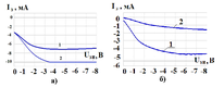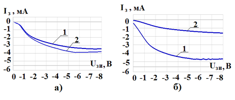 Рис. 10. Зависимости токов утечки затворов Шоттки GaN СВЧ транзисторов Iз от напряжения Uзи СВЧ транзисторов на нитриде галлия для различных систем металлизации: а) – Ni/Au, b) – Ir/Au; 1– до термической обработки, 2 – после термической обработки при Т=500оС в течение 30-ти минут