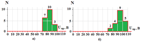 Рис. 8. Распределение пробивных напряжений Uпр на выборке N=20 GaN СВЧ транзисторов: а) – без слоя суспензии алмаза на поверхности между истоком, затвором и стоком; б) – со слоем суспензии алмаза на поверхности между истоком, затвором и стоком.