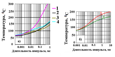 Рис.1. Зависимость температуры области канала между затвором и стоком GaN СВЧ транзистора от длительности СВЧ импульса для различных материалов подложки: а) 1 – кремний толщиной h=100мкм; 2 – карбид кремния толщиной h=100мкм; 3 – поликристаллический алмаз толщиной h=100мкм, выращенный на кремнии с остаточной толщиной h1=10мкм; 4 – поликристаллический алмаз толщиной h=100мкм, выращенный на кремнии с толщиной h2 =20мкм;б) – карбид кремния с учетом зависимости тепловых параметров от температуры по данным различных источников, указанных в диссертации.