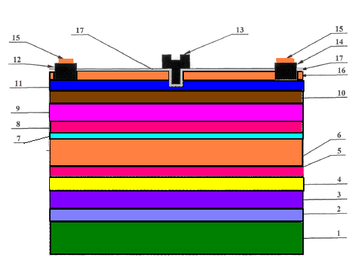 Рис.6. Структура AlGaN/GaN СВЧ транзисторе с полиалмазным слоем и буферными слоями A1N или HfN: 1 - фланец марки МД-40; слой припоя из AuSn; 2- медный пьедестал; 3- подслой из AuSn;4 - базовая подложка из монокристаллического кремния; 5- буферный слой A1N или HfN; 6- теплопроводящий слой CVD поликристаллического алмаза; 7- нелегированный слой из GaN; 8- буферный слой из AlN; 9 - слой твердого раствора из AlGaN (спейс); 10- слой твердого раствора из AlGaN n+типа проводимости; 11- слой твердого раствора из AlGaN (крыша); 12- исток; 13- затвор; 14- сток; 15- омические контакты; 16- дополнительный теплопроводящий слой поликристаллического алмаза; 17- дополнительный барьерный слой из двуокиси гафния.