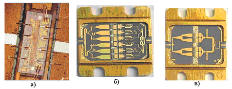 Рис. 15. Конструкция базового кристалла СВЧ НЕМТ – а) и внутрисогласованные СВЧ транзисторы на основе базового кристалла НЕМТ производства ФГУП «НПП «Пульсар»: