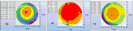 Результаты распределения неоднородности поверхностного сопротивления металлизированного слоя показывают сложную картину распределения неоднородностей по поверхности структуры для поверхностного сопротивления пленок титана, алюминия, никеля и хрома приведены на рис.14.