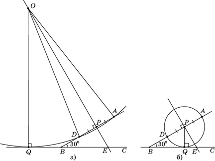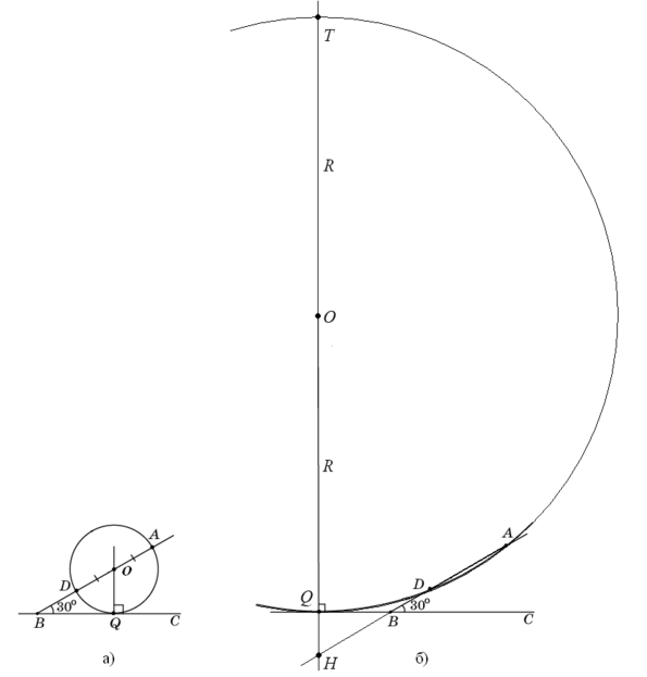 Центр O искомой окружности принадлежит серединному перпендикуляру к отрезку AD. Обозначим P середину отрезка AD, Q – основание перпендикуляра, опущенного из точки O на прямую BC, E – точку пересечения серединного перпендикуляра с прямой BC (см. рисунок а). Из условия касания окружности и прямой BC следует, что отрезки OA, OD и OQ равны радиусу R окружности.