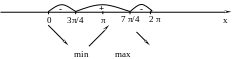 y’ = 0 => sin x = -cos x; cos x ≠ 0 => tg x = -1 => x = -π/4 + πn, n€z;