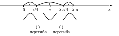 y’’ = 0 => sin x = cos x; cos x ≠ 0 => tg x =1 => x = π/4 + πn, n€z;