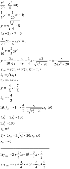Составить уравнения касательных к гиперболе x2/20 – y2/5 =1 перпендикулярных к прямой 4x+3y-7=0.