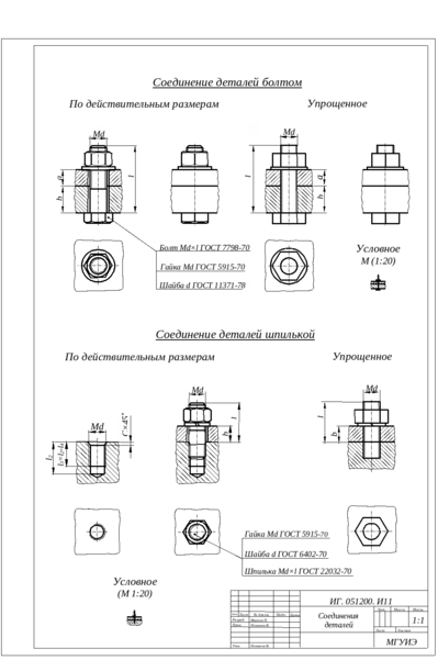 В данном варианте исполнения для вычерчивания соединений болтом и шпилькой следует использовать формат А2 (см. образец выполнения задания на стр. 15) или два формата А3.