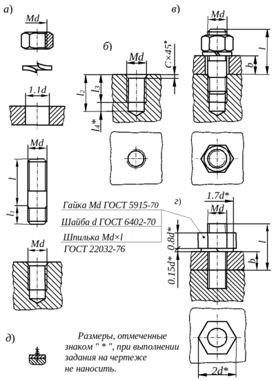 На рис. З, г показано упрощенное изображение соединения деталей шпилькой в соответствии с ГОСТ 2.315-68, вычерченное по относительным размерам в зависимости от номинального диаметра (d) резьбы, а на рис. 3, д - условное.