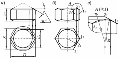 2. Вычертить главное изображение, используя для построения вид сверху и размер высоты (m) гайки. Значение угла для фаски на внешней поверхности гайки рекомендуется принять равным 30°, а значение диаметра dw взять равным 0,9S, что позволит сделать главное изображение более выразительным (рис. 2, а);