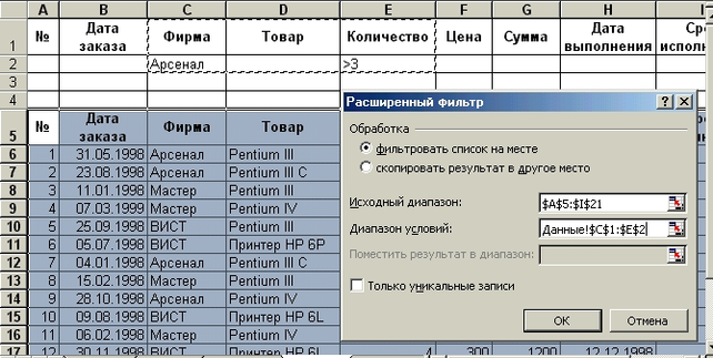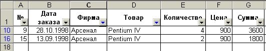 На рис. 8.4. приведен пример отображения фрагмента списка с Автофильтром по двум полям: Фирма = «Арсенал» и Товар = «Pentium IV».