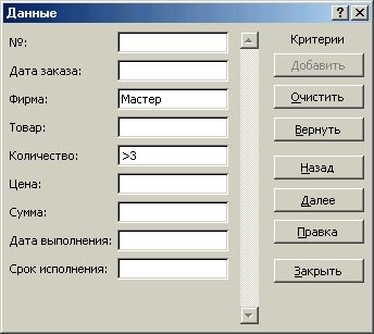 Например, на рис. 8.2 изображено задание критерия отбора: Фирма = «Мастер» и Количество >3. После нажатие на кнопку Далее или Назад в форме будут отображаться записи, удовлетворяющие этим условиям.