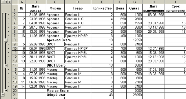 В MS Excel имеется средство, позволяющее получить обобщенные данные, если требуется объединить данные в отдельные группы, например, сгруппировать поставки по фирмам или товарам. Использование команды Итоги позволит, не составляя формул и не преобразуя таблицу, найти промежуточные и общие итоги, структурировать данные и вставить в таблицу строки с промежуточными и общими итогами.