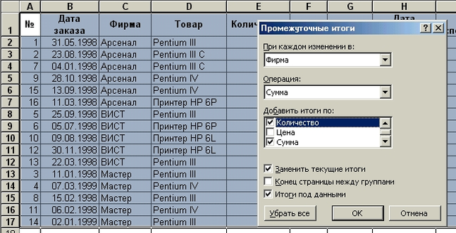 Чтобы заменить все старые промежуточные итоги на вновь созданные, установите флажок Заменить текущие итоги. В нашем случае положение этого флажка не существенно, так как никаких итогов в нашем списке нет;