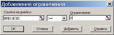 Для ввода ограничений в поле Ссылка на ячейку вводится левая часть ограничений – B2:C2, в поле Ограничение - правая часть, в нашем случае - 0. Раскрывающийся список позволяет задать тип соотношения. В нашем случае следует выбрать соотношение >=. Таким образом, требование не отрицательности переменных задано.
