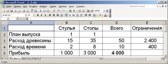 В нашем случае фирме необходимо спланировать объемы производства столов и стульев так, чтобы максимизировать прибыль. Поэтому в этой задаче неизвестными переменными являются: