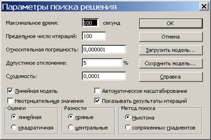В этом окне можно изменять условия и варианты поиска решения исследуемой задачи. Значения и состояния элементов управления, используемые по умолчанию, подходят для решения большинства задач.