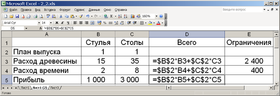 Рис. 8.21. Рабочий лист для расчета прибыли и ограничений