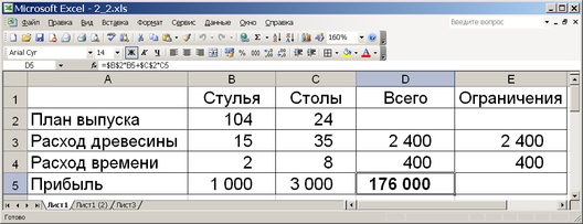 MS Excel нашел оптимальный план производства, при котором прибыль будет максимальной. Из рисунка видно, что оптимальным является производство в 104 стульев и 24 столов. Этот план выпуска продукции обеспечит наибольшую прибыль – 176 тыс. руб.