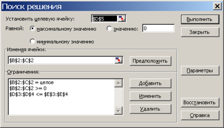 | Список | Допускаются ограничения в виде равенств, неравенств или требования целочисленности. Ограничения добавляются по одному (кнопка Добавить). Для завершения ввода ограничений следует нажать кнопку ОК. |