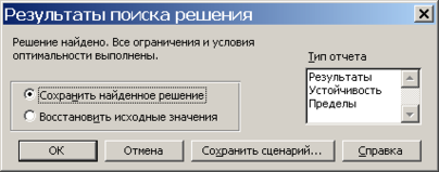 3. Для запуска процесса поиска решения следует нажать кнопку Выполнить. На экране отобразится окно Результаты поиска решения (рис. 8.24).