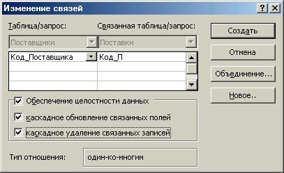 В этом окне Access заполнил первую строку именем поля, по которому связывались таблицы. Чтобы в связанных таблицах не нарушалась целостность данных (в данном случае выполнялись ссылки только на существующих поставщиков), нужно щелкнуть по флажку «Обеспечение целостности данных».
