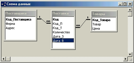 Для определения связей выполнить команду Сервис|Схема данных или на панели инструментов нажать кнопку Схема данных