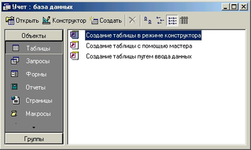 Назовем нашу учебную БД «Учет». На экране появляется окно базы данных (рис.11.2.), в котором можно получить посредством панели «Объекты» доступ ко всем ее объектам: таблицам, запросам, отчетам, формам, макросам, модулям.