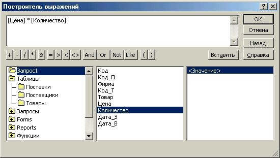 на панели инструментов. Перед обращением к Построителю запрос следует сохранить, в противном случае имена полей, вставленных в запрос ранее, будут недоступны. При вызове Построителя открывается окно Построитель выражений (рис. 11.11).