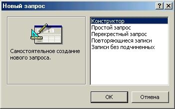Для создания запроса следует перейти на вкладку Запросы и нажать кнопку Создать. Появится окно Новый запрос для выбора способа построения запроса (рис 11.8). Конструктор - создает запрос на основе пустого бланка запроса.